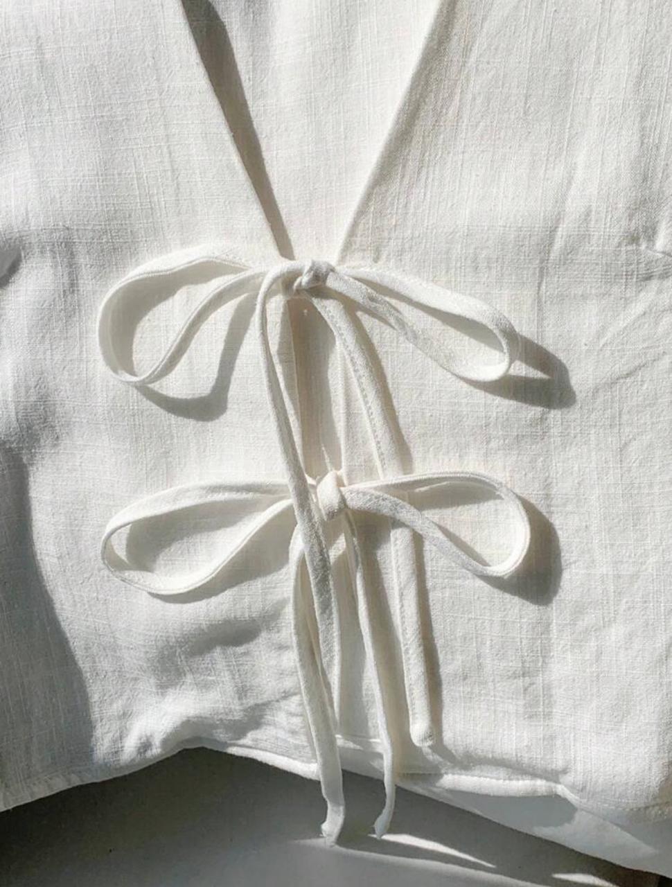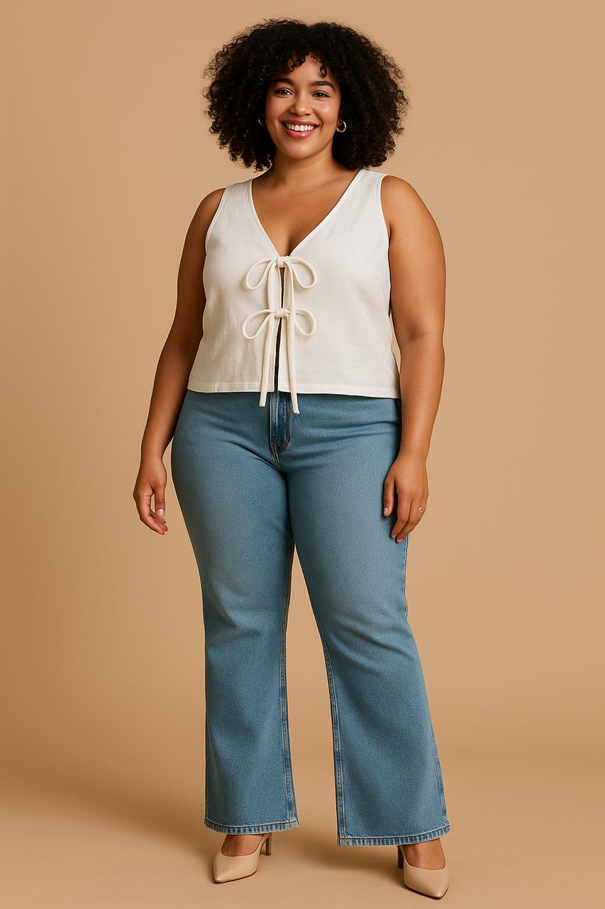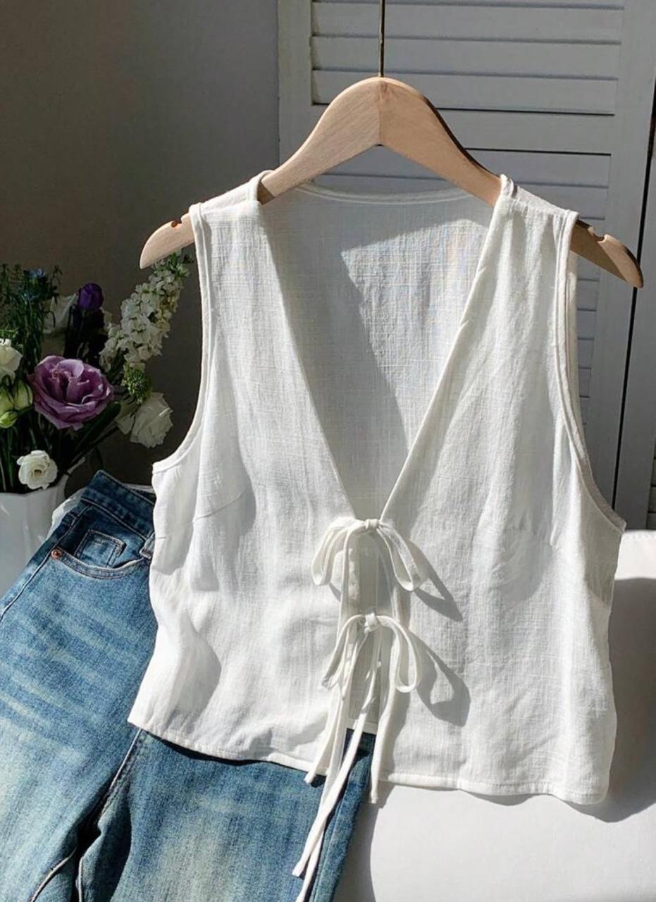 Blusa sin mangas, con lazos frontales, confeccionada en tela ligera de caída suave. Su diseño con escote en V y ajuste de moños aporta un toque moderno, versátil y elegante para outfits casuales