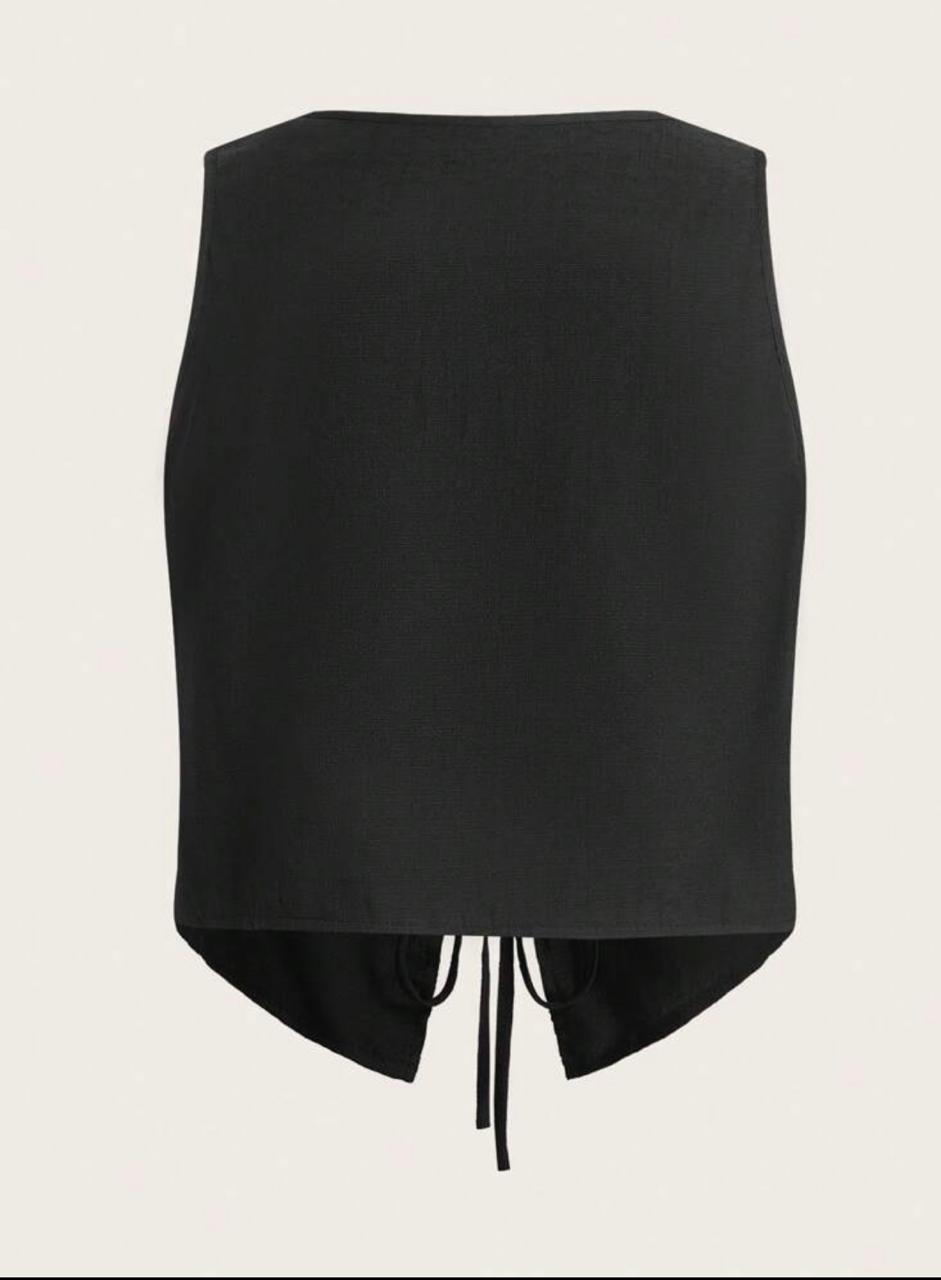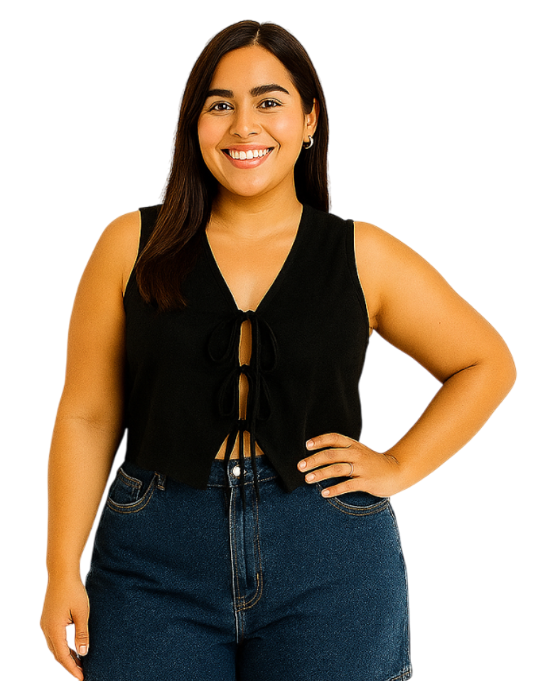 Blusa sin mangas, con lazos frontales, confeccionada en tela ligera de caída suave. Su diseño con escote en V y ajuste de moños aporta un toque moderno, versátil y elegante para outfits casuales