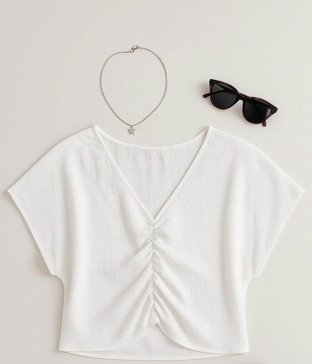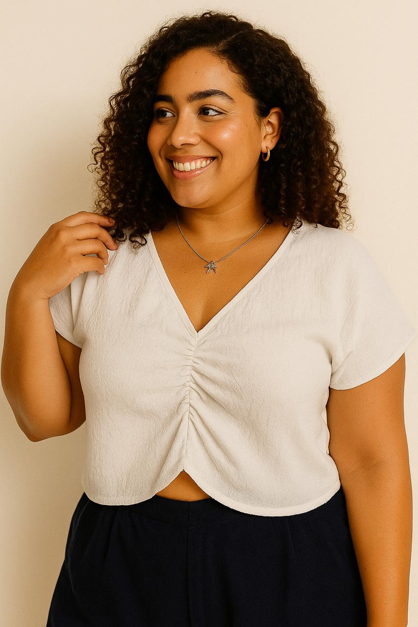 Blusa blanca plus size con mangas murciélago y escote en V, confeccionada en tela ligera de textura suave que aporta frescura y comodidad. El fruncido frontal crea un efecto favorecedor que estiliza la silueta, perfecta para combinar con jeans, faldas o pantalones y lograr outfits casuales, modernos y versátiles en cualquier ocasión.