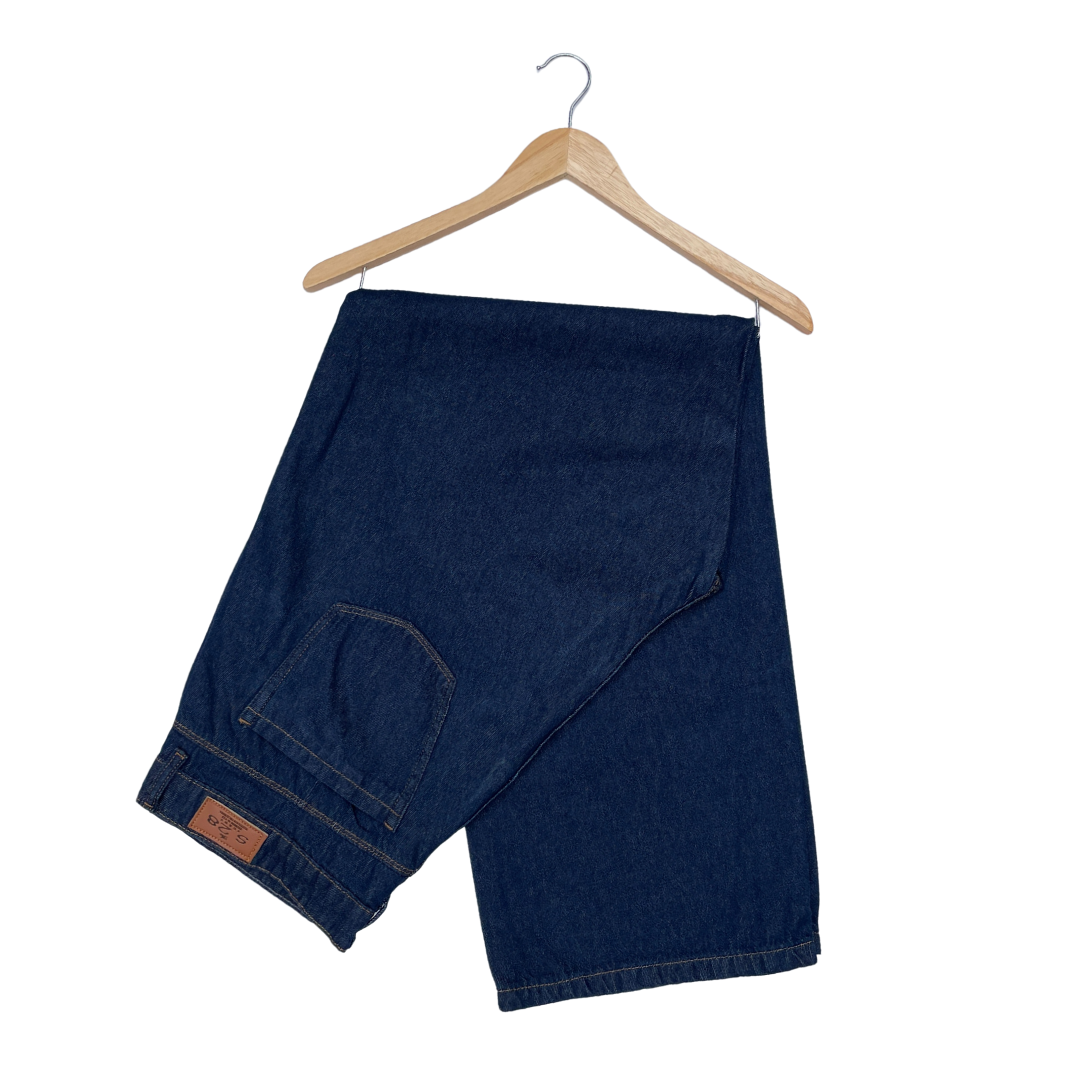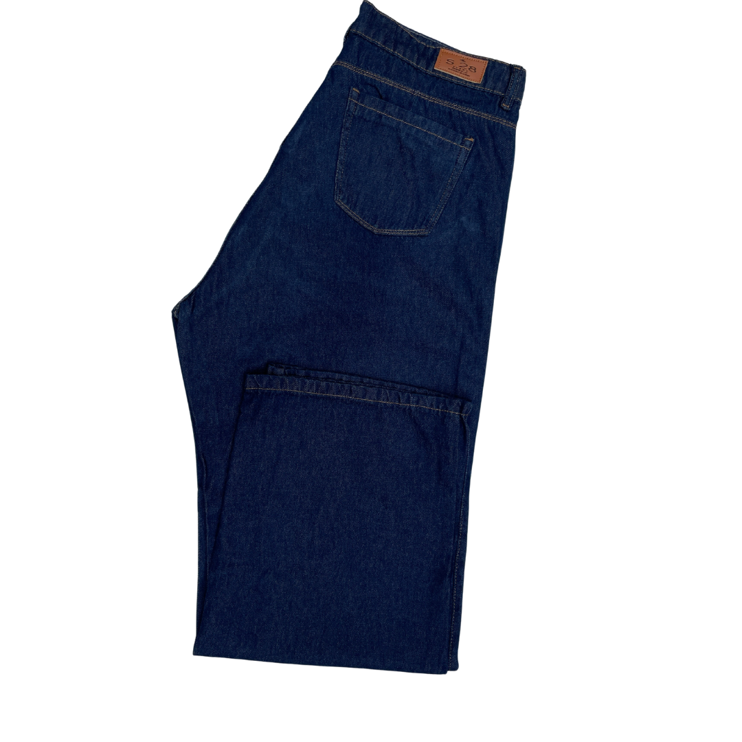 Denim rígido con tiro alto que define cintura y equilibra la silueta. Corte recto, estilo atemporal y lleno de actitud