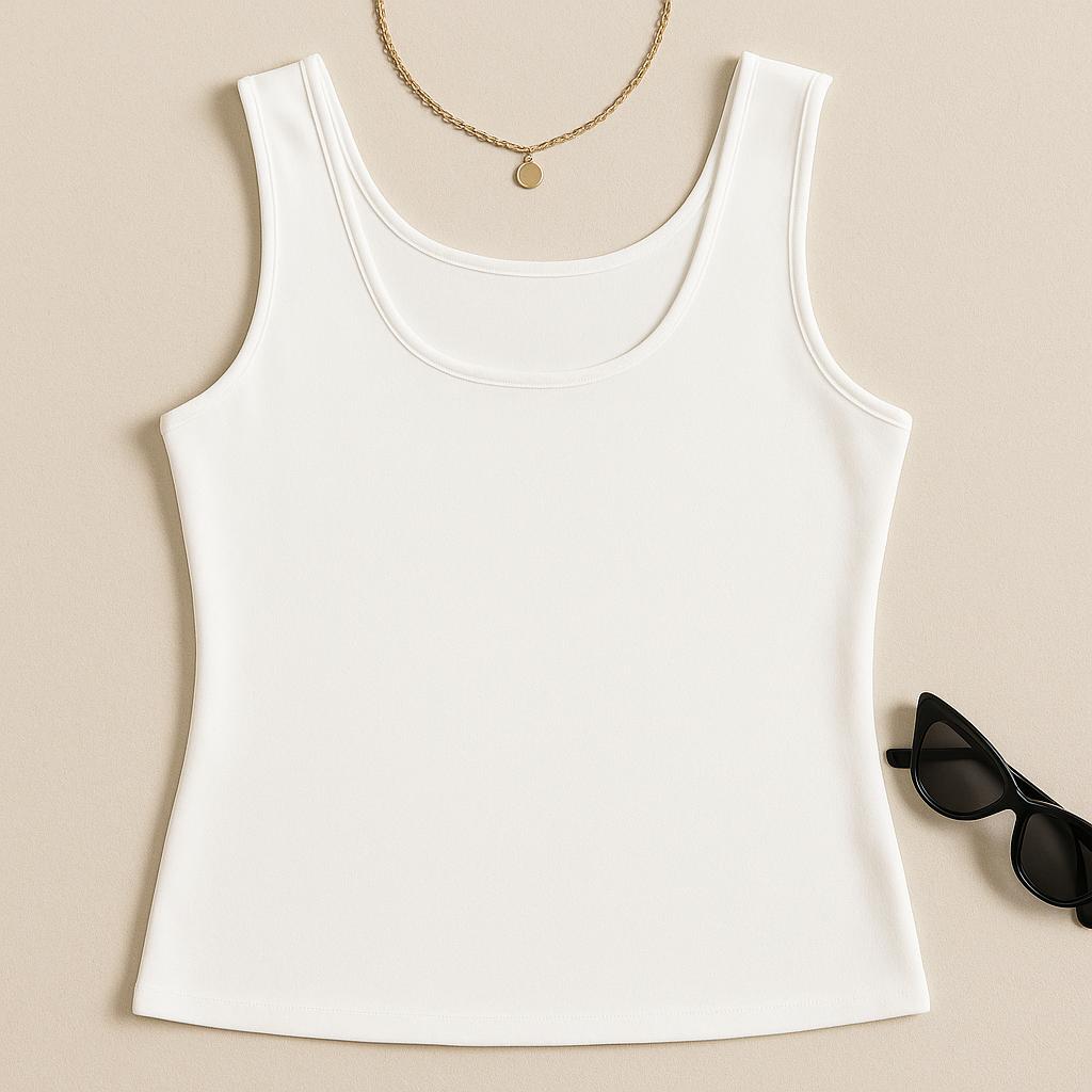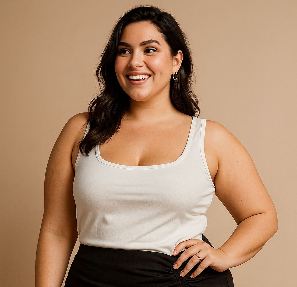 Top básico color blanco plus size con escote scoop, confeccionado en tela suave y elástica que se ajusta cómodamente al cuerpo. Su diseño minimalista y versátil es ideal para crear outfits casuales, usar en capas o combinar con jeans, faldas y pantalones en cualquier ocasión.