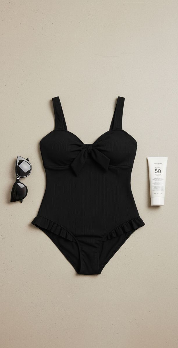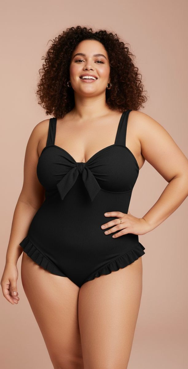 Traje de baño entero plus size en clásico color negro, con delicado lazo en el pecho y sutiles detalles flare en la parte inferior que aportan movimiento. Su diseño elegante y favorecedor resalta las curvas, combinando comodidad, estilo y un toque femenino perfecto para brillar en la playa o la piscina.