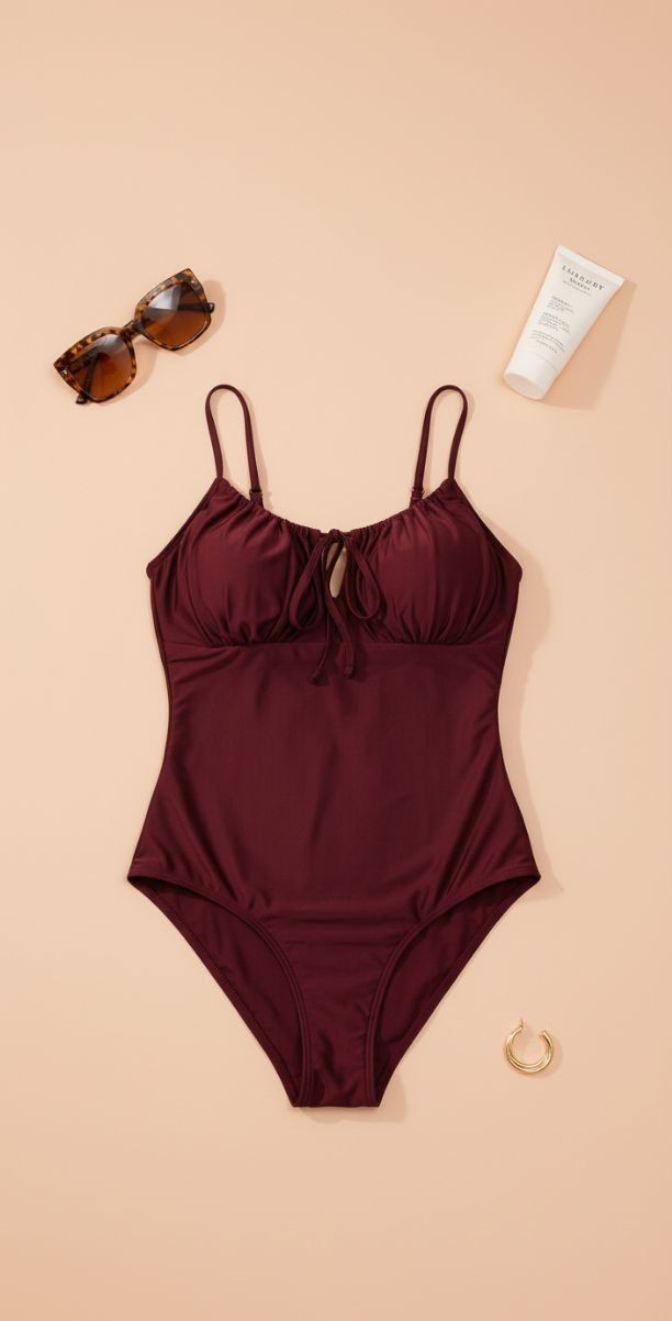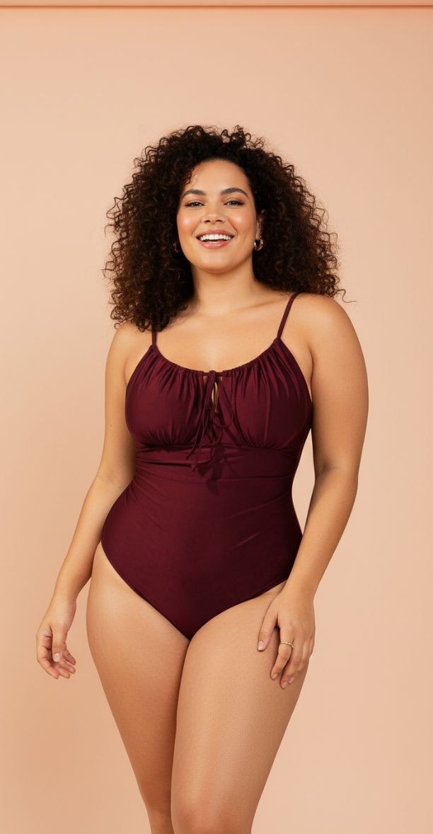 Traje de baño entero plus size en elegante color vinotinto, confeccionado en tela de secado rápido y ajuste cómodo. El fruncido en el pecho crea un efecto favorecedor que realza el busto, aportando un toque sofisticado y seguro para disfrutar del sol con estilo y confianza.